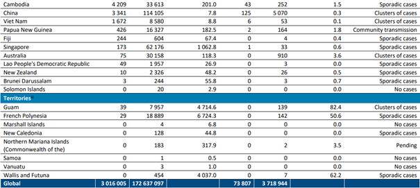 En çok yeni vaka bildiren üç ülke; Malezya (52.040 yeni vaka; 100.000 başına 160,8 yeni vaka,% 3 azalma), Filipinler (45.681 yeni vaka; 100.000 başına 41,7 yeni vaka,%19 artış) ve Japonya (18.649 yeni vaka; 100.000 başına 14,7 yeni vaka, % 32 azalma) olmuştur.