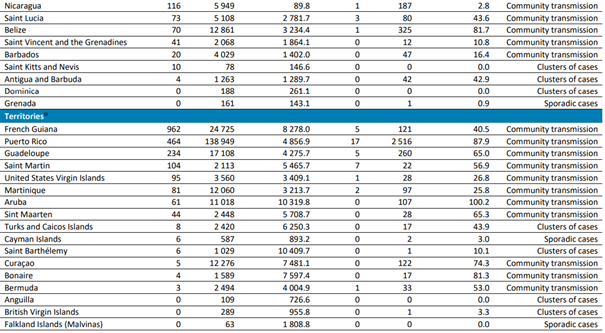 En çok ölüm vakalarının bildirildiği ülkeler yine; Brezilya (11.797 yeni ölüm; 100.000'de 5,5 yeni ölüm; %7 azalma), Meksika (5496 yeni ölüm; 100.000'de 4,3 yeni ölüm; %203 artış) ve Arjantin (3718 yeni ölüm; 100.000'de 8,2 yeni ölüm;% 13 artış) olmuştur.