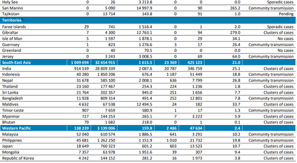 Güneydoğu Asya bölgesi, bir önceki haftaya göre % 31’lik düşüşle 1 milyondan fazla yeni vaka, ölüm oranlarında ise %21'lik düşüşle 23.000’den fazla yeni ölüm vakası bildirmiştir. Genel vaka ve ölüm insidansı Hindistan'daki eğilimlere paralel olarak keskin bir şekilde azalmaya devam ederken bölgenin başka yerlerinde belirgin artışlar gözlenmiştir. En çok yeni vaka bildiren üç ülke; Hindistan (914.539 yeni vaka; 100.000'de 66,3 yeni vaka;% 33 azalma), Endonezya (40.280 yeni vaka; 100.000'de 14,7 yeni vaka; yüzde oranı bir önceki haftaya benzer) ve Nepal (31.678 yeni vaka; 100.000 başına 108,7 yeni vaka;% 34 azalma) olmuştur.