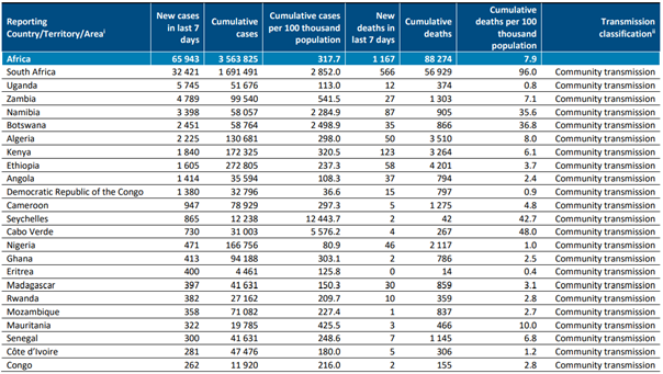 En yüksek sayıda yeni vaka bildiren ülkeler sırasıyla; Güney Afrika (32.421 yeni vaka; 100.000 kişi başına 54,7 yeni vaka;% 22 artış), Uganda (5745 yeni vaka; 100.000 kişi başına 12,6 yeni vaka;% 137 artış) ve Zambiya (4789 yeni vaka; 100.000 kişi başına 26,0 yeni vaka; % 191 artış) olmuştur.
