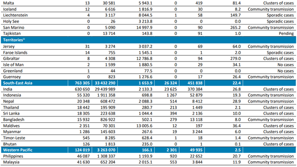 En çok yeni ölüm vakası bildiren üç ülke; Hindistan (23.625 yeni ölüm; 100.000'de 1,7 yeni ölüm, % 14 artış), Endonezya (1267 yeni ölüm; 100.000'de 0,5 yeni ölüm,%5 artış) ve Nepal (514 yeni ölüm; 100.000'de 1,8 yeni ölüm; % 18 azalma) olmuştur.