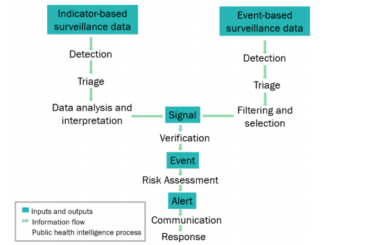 Halk sağlığı istihbaratı (PHI), insan sağlığı için potansiyel risk oluşturan olaylar (örneğin hastalık, doğal afet, kimyasal maruziyet) hakkındaki bilgilerin tespiti, doğrulanması, değerlendirilmesi, araştırılması ve iletilmesi ile ilgili tüm faaliyetleri kapsayan kavramsal bir çerçevedir. PHI, resmi kaynaklardan yapılandırılmış verileri kullanan gösterge tabanlı sürveyans (IBS) ve akut halk sağlığı olaylarını ve/veya risklerini tespit etmek için medya makaleleri, yardım hatları ve topluluk raporları gibi resmi olmayan kaynakları kullanan kanıta dayalı sürveyans (EBS) tarafından bilgilendirilen bir erken uyarı ve yanıt sistemi olarak hizmet etmektedir. EBS, bilgileri organize bir şekilde hızlı bir şekilde toplamayı, izlemeyi, değerlendirmeyi ve yorumlamayı ve IBS'den türetilen bilgileri tamamlamayı amaçlamaktadır EBS, devam eden olaylardaki ilgili değişikliklerin yanı sıra yeni halk sağlığı tehditlerinin tespiti, triyaj (filtreleme ve seçim) ve doğrulamasını içermektedir. Ayrıca, sonuç olarak bir yanıta yol açabilecek risk değerlendirmelerini de tetiklemektedir (Şekil 3). Başarılı EBS, verimli ağlara, zamanında bilgi paylaşımına, çeşitli kaynaklara, işbirliğine ve paydaşların katılımına bağlıdır. Sinyal, potansiyel bir halk sağlığı riski olarak toplanan ve önceliklendirilen ve devam eden bir olaydaki değişiklikleri içerebilen bilgilerdir. IBS verilerini tamamlamak için medya ve topluluk kaynaklarından sinyaller hızla algılanır ve bu, EBS'nin PHI'ye sistematik entegrasyonunun önemini gösterir. EBS, gözetim yapılarının sınırlı veya eksik olabileceği IBS'ye kıyasla sınırlı kaynaklı ortamlarda daha kolay kurulabilmektedir.