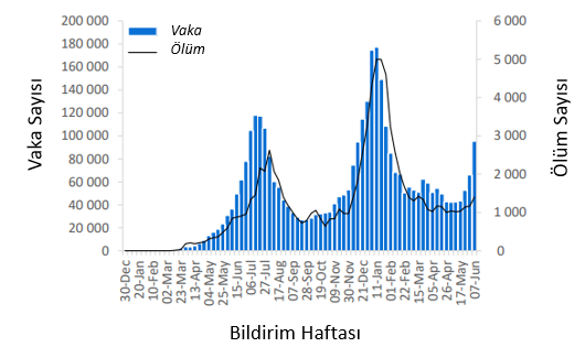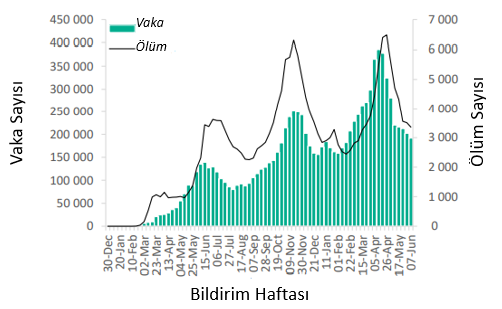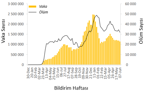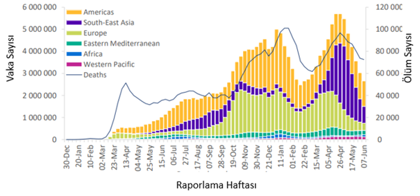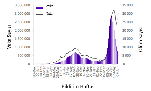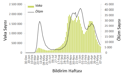 Küresel vaka ve ölüm insidansları, haftalık 2,6 milyondan fazla yeni vaka ve 72.000'den fazla yeni ölüm ile yeni vaka ve ölüm vakalarının sayısı azalmaya devam etmiştir; bir önceki haftaya göre sırasıyla % 12'lik ve % 2'lik bir düşüş gerçekleşmiştir (Şekil 1). Küresel olarak bildirilen vaka sayısı şu anda 175 milyonu aşarken, Şubat 2021'den bu yana, geçen hafta en düşük haftalık vaka insidansı görülmüştür. Afrika Bölgesi hariç tüm Bölgelerde yeni haftalık vaka sayısında düşüş olduğu bildirilmiştir. Güneydoğu Asya Bölgesi, Avrupa Bölgesi ve Btı Pasifik Bölgesi geçen haftada yeni vaka sayısında belirgin düşüşler olduğunu bildirirken, Amerika Bölgesi ve Doğu Akdeniz Bölgesi yeni vaka sayılarında bir önceki hafta ile benzer rakamlar bildirmiştir (Tablo 1). Geçen hafta rapor edilen yeni ölümlerin sayısı Afrika ve Güneydoğu Asya Bölgeleri hariç tüm bölgelerde azalırken küresel ölüm oranı her gün bildirilen 10.000’den fazla ölüm görülme sıklığı ile yüksek seviyelerde kalmaya devam etmektedir. En çok etkilenen ülkelerin bazılarında salgınlar yavaşlama belirtileri göstermeye başlarken ve küresel haftalık ölüm oranı art arda altı haftadır düşmeye devam ederken, tüm DSÖ Bölgelerindeki birçok ülke; aşılara erişim, ortaya çıkan SARS CoV-2 varyantlarının yayılması ve aşırı yüklenilmiş sağlık sistemleri ile mücadele etmeye devam etmektedir.