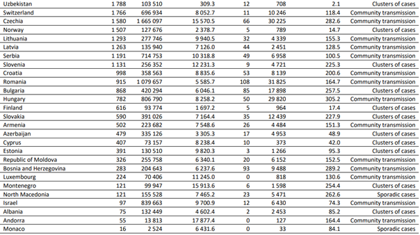 En çok ölüm vakası bildiren ülkeler; Rusya (2643 yeni ölüm; 100.000 kişi başına 1,8 yeni ölüm, %1 artış), Almanya (612 yeni ölüm; 100.000'de 0,7 yeni ölüm; %25 azalma) ve Türkiye (600 yeni ölüm; 100.000 kişi başına 0,7 yeni ölüm,% 25 azalma) olmuştur.