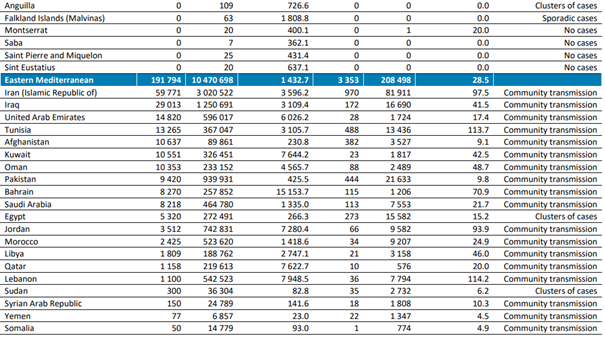 En çok yeni ölüm vakası bildiren ülkeler; İran (970 yeni ölüm, 100.000 kişi başına 1,2 yeni ölüm,% 19 azalma), Tunus (488 yeni ölüm, 100.000'de 4,1 yeni ölüm, %30 artış) ve Pakistan (444 yeni ölüm, 100.000'de 0,2 yeni ölüm,% 13 azalma) olmuştur.