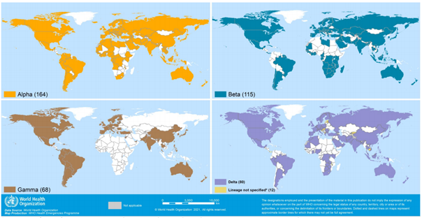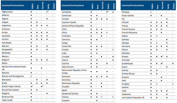 Şekil 4. 15 Haziran 2021 itibarıyla Alfa, Beta, Gama ve Delta varyantlarını bildiren ülkeler, yönetim bölgeleri ve bölgeler