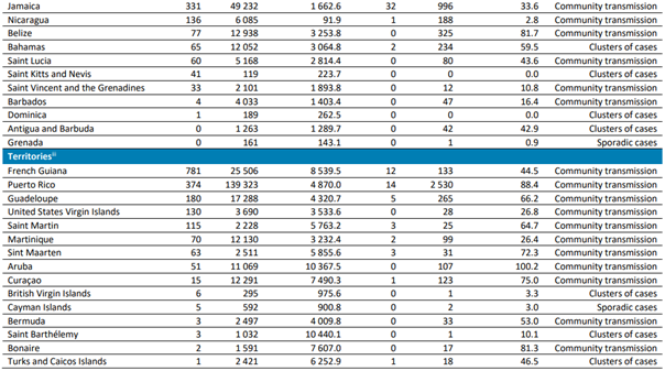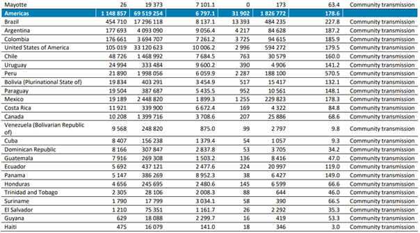 En çok ölüm vakalarının bildirildiği ülkeler yine; Brezilya (13.393 yeni ölüm; 100.000'de 6,3 yeni ölüm; %14 artış), Arjantin (4217 yeni ölüm; 100.000'de 9,3 yeni ölüm; %13 artış) ve Kolombiya (3725 yeni ölüm; 100.000'de 7,3 yeni ölüm; yüzde oranı bir önceki haftaya benzer) olmuştur.