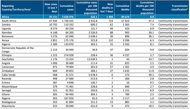 Afrika Bölgesi bir önceki haftaya göre 95.000’den fazla yeni vaka ve 1400’den fazla yeni ölüm vakası bildirmiş olup, bir önceki haftaya göre vaka sayılarında %44’lük artış göstermiştir ve ölüm sayılarında ise %20’lik artış göstermiştir. Bölge, art arda üç haftadır haftalık vaka insidansında belirgin bir artış olduğunu bildirmiş olup en büyük artışlar Afrika'nın Güney, Doğu ve Kuzey bölgelerindeki ülkelerde gerçekleşmiştir.