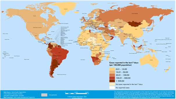 En fazla yeni vaka bildiren ülkeler: Hindistan (630.650 yeni vaka;% 31 azalma), Brezilya (454.710 yeni vaka; yüzde oranı bir önceki haftaya benzer), Arjantin (177.693 yeni vaka;% 17 azalma), Kolombiya (176.661 yeni vaka; yüzde oranı bir önceki haftaya benzer) ve Amerika Birleşik Devletleri (105.019 yeni vaka;% 6 artış).