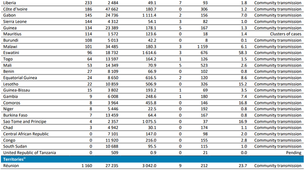 En yüksek sayıda yeni ölüm vakası bildiren ülkeler; Güney Afrika (724 yeni ölüm; 100.000'de 1,2 yeni ölüm;% 28 artış), Kenya (132 yeni ölüm; 100.000’de 0,2 yeni ölüm; %7 artış) ve Namibya (88 yeni ölüm; 100.000'de 3,5 yeni ölüm;% 1 artış) olmuştur.