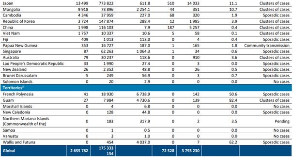 En fazla yeni ölüm vakası rapor eden üç ülke; Filipinler (920 yeni ölüm; 100.000'de 0,8 yeni ölüm,% 9 azalma), Malezya (533 yeni ölüm; 100.000'de 1,7 yeni ölüm,% 14 düşüş) ve Japonya (510 yeni ölüm; 100.000'de 0,4 yeni ölüm; %15 azalma) olmuştur.
