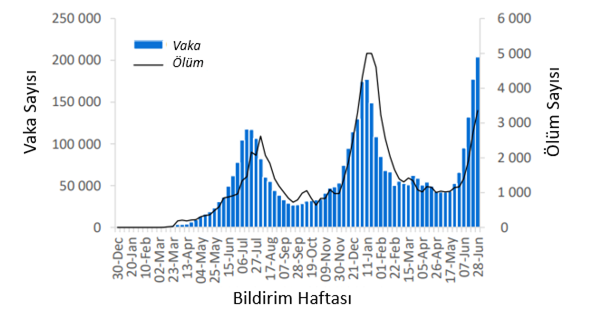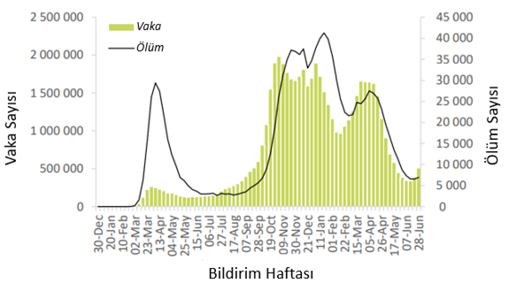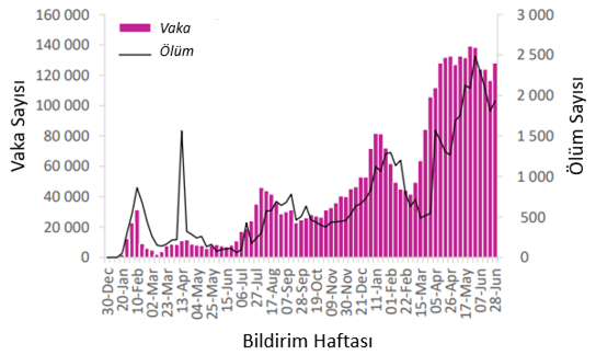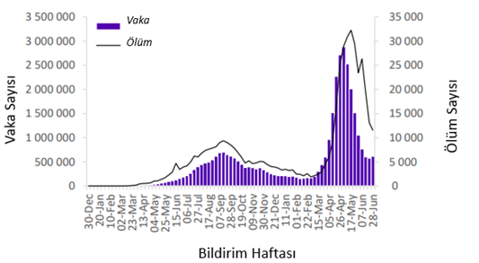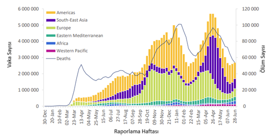 Küresel olarak, art arda yedi hafta boyunca yeni bildirilen vakalarda düşüşün ardından, son iki haftada yeni haftalık vakalarda geçen hafta (28 Haziran – 4 Temmuz 2021) bildirilen 2,6 milyondan fazla vaka ile bir önceki yıla göre yeni vaka sayısında hafif bir artış olmuştur (Şekil 1). Haftalık ölüm vakası sayısı düşmeye devam etmiş, geçen hafta bildirilen 54.000'in biraz altında ölüm vakasıyla, önceki haftaya göre %7'lik bir düşüş göstermiştir. Bu, Ekim 2020'nin başından bu yana en düşük haftalık ölüm rakamıdır. Küresel olarak rapor edilen kümülatif vaka sayısı şu anda 183 milyonu aşmakta olup ölüm sayısı neredeyse 4 milyona ulaşmıştır.