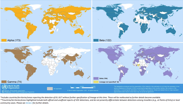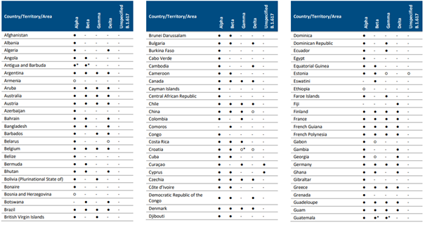 Küresel olarak, 173 ülke, yönetim bölgesi veya bölgede (bundan sonra ülkeler olarak anılacak; geçen hafta bir yeni ülke), Beta varyantı 122 ülkede (üç yeni ülke), Gamma varyantı 74 ülkede (iki yeni ülke) ve Delta varyantı 104 ülkede (7 yeni ülke) bildirilmiştir.