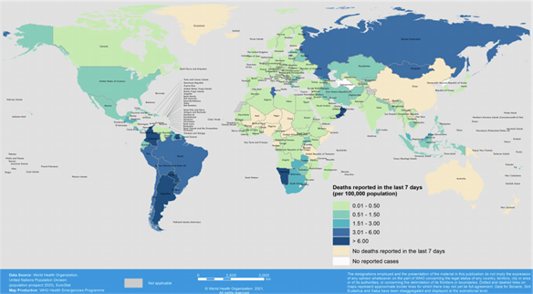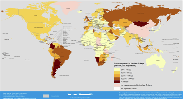 Küresel olarak, art arda yedi hafta boyunca yeni bildirilen vakalarda düşüşün ardından, son iki haftada yeni haftalık vakalarda geçen hafta (28 Haziran – 4 Temmuz 2021) bildirilen 2,6 milyondan fazla vaka ile bir önceki yıla göre yeni vaka sayısında hafif bir artış olmuştur. Haftalık ölüm vakası sayısı düşmeye devam etmiş, geçen hafta bildirilen 54.000'in biraz altında ölüm vakasıyla, önceki haftaya göre %7'lik bir düşüş göstermiştir.