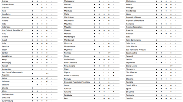 *** Yolcular arasında VOC tespitini bildiren ülkeleri / bölgeleri / alanları (örn. Giriş noktalarında tespit edilen importe vakalar) veya yerel vakaları (toplulukta tespit edilen) içerir. Bunları gelecek raporlarda farklılaştırmak için çalışmalar devam etmektedir. Endişe verici varyantın tespit edildiğini hiç bildirmemiş ülkeleri, bölgeleri ve alanları hariç tutmaktadır.