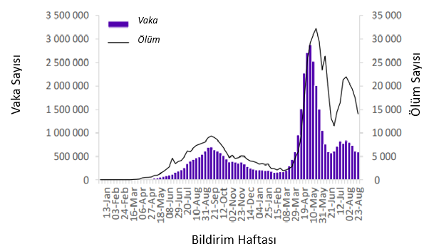Bu hafta (23-29 Ağustos) bildirilen 4,4 milyonun altında yeni vakayla, küresel olarak bildirilen yeni vaka sayısı, yaklaşık iki aylık artıştan sonra bir önceki haftaya benzer şekilde devam etmektedir (Şekil 1). Yeni vakalarda bir önceki haftaya kıyasla %7'lik artış bildiren Batı Pasifik Bölgesi hariç, tüm bölgeler ya düşüş (Afrika ve Amerika Bölgeleri) ya da benzer bir eğilim (Avrupa, Güneydoğu Asya ve Doğu Akdeniz Bölgeleri) bildirmiştir.