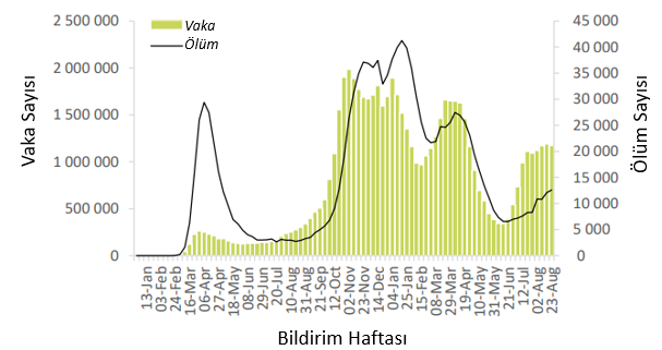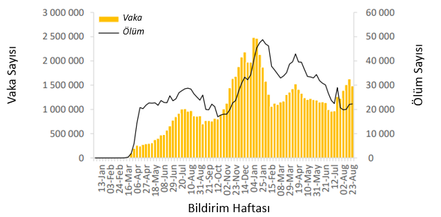 Bu hafta küresel olarak bildirilen ölümlerin sayısı, 67.000'den fazla yeni ölüm vakasıyla birlikte geçen haftaya benzer bir şekilde gerçekleşmiştir. Doğu Akdeniz ve Batı Pasifik Bölgeleri haftalık ölüm sayısında sırasıyla %9 ve %16 artış bildirirken, Güneydoğu Asya Bölgesi en büyük düşüşü (%20) bildirmiştir. Afrika, Avrupa ve Amerika Bölgelerinde bildirilen ölümlerin sayısı geçen hafta ile benzerlik göstermiştir. Küresel olarak bildirilen kümülatif vaka sayısı şu anda yaklaşık 216 milyon ve kümülatif ölüm sayısı 4,5 milyonun biraz altındadır.