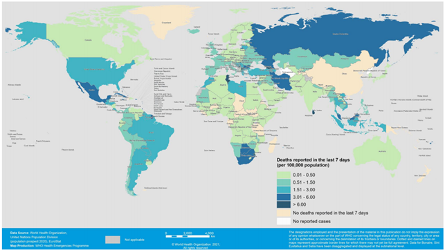 Şekil 3. Ülkelere ve bölgelere göre, son yedi günde 100.000 nüfus başına bildirilen COVID-19 ölüm vakaları, 23-29 Ağustos 2021 **