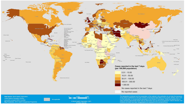 Doğu Akdeniz Bölgesi, ölümlerde yüksek bir haftalık insidans bildirmiştir (100.000 nüfus başına 1.1). En çok yeni vaka bildiren ülkeler: Amerika Birleşik Devletleri (938.014 yeni vaka; %8 azalma), Hindistan (270.796 yeni vaka; %17 artış), İran (254.753 yeni vaka; yüzde oranı bir önceki haftaya benzer), Birleşik Krallık (237.556 yeni vaka; %8 artış) ve Brezilya (175.807 yeni vaka; %16 azalma) olmuştur. Küresel olarak, 193 ülke (geçen haftadan bu yana bir yeni ülke), yönetim bölgesi ve bölgede (bundan sonra ülkeler olarak anılacaktır) Alfa varyantı vakaları rapor edilirken, 141 ülkede ( yeni ülke yok) Beta varyantı vakaları, 91 ülke (beş yeni ülke) Gama varyantı vakaları ve 170 ülke (yedi yeni ülke) Delta varyantı vakaları bildirmiştir.