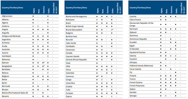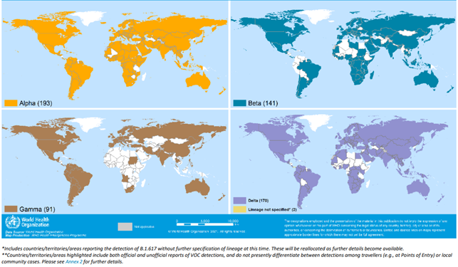 Şekil 4. 31 Ağustos 2021 itibarıyla Alfa, Beta, Gama ve Delta varyantlarını bildiren ülkeler, yönetim bölgeleri ve bölgeler**
