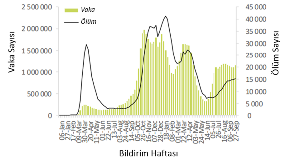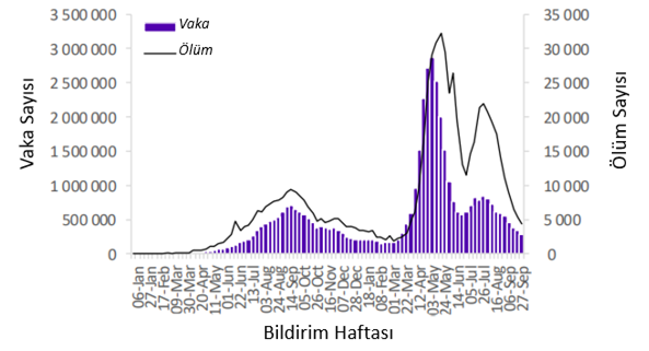 Küresel olarak, haftalık COVID-19 vaka ve ölümlerinin sayısı düşmeye devam etmiştir. Bu, Ağustos ayından beri gözlemlenen bir eğilimdir (Şekil 1). 27 Eylül - 3 Ekim 2021 haftasında 3,1 milyondan fazla yeni vaka ve 54 000'den biraz fazla yeni ölüm bildirilmiştir. Bu hafta vakalar önceki haftaya göre %9 azalırken, ölüm sayısı önceki haftaya benzer şekilde gerçekleşmiştir (Tablo 1). Bir önceki haftaya benzer bir vaka sayısı bildiren Avrupa Bölgesi dışında tüm bölgeler bu hafta yeni vaka sayısında düşüş bildirmiştir. Yeni haftalık vakalarda en büyük düşüş Afrika Bölgesinde (%43), ardından Doğu Akdeniz Bölgesinde (%21), Güneydoğu Asya Bölgesinde (%19), Amerika Bölgesinde (%12) ve Batı Pasifik (%12) gerçekleşmiştir. Küresel olarak bildirilen teyit edilmiş vakaların kümülatif sayısı şu anda 234 milyonun üzerinde ve kümülatif ölüm sayısı 4,8 milyonun biraz altındadır.