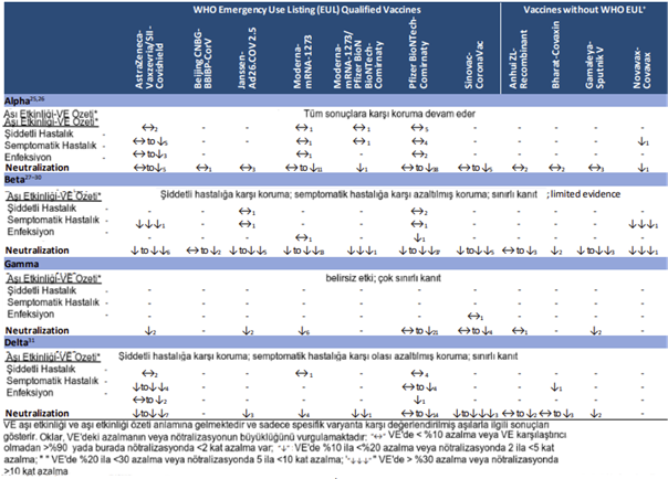 • Varyantların aşı performansı üzerindeki etkisinden zayıflamanın etkisini ortaya çıkarmak mümkün olmadığında, bazı VE tahminleri yukarıdaki tabloya dahil edilmeyebilir.