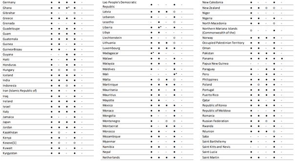 ** Seyahat edenler arasında VOC tespitini bildiren ülkeleri / bölgeleri / alanları (örn. Giriş noktalarında tespit edilen importe vakalar) veya yerel vakaları (toplulukta tespit edilen) içerir. Endişe verici varyantın tespit edildiğini hiç bildirmemiş ülkeleri, bölgeleri ve alanları hariç tutmaktadır.
