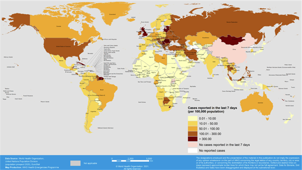 En fazla yeni vaka sayısı bildiren ülkeler: 100.000 nüfus başına en yüksek haftalık vaka insidansı oranlarını bildiren bölgeler, Avrupa Bölgesi (100 000 nüfus başına 123,1 yeni vaka) ve Amerika Bölgesi (100 000 nüfus başına 109.5 yeni vaka) olurken, aynı iki bölge bu haftaki 100.000 nüfus başına en yüksek ölüm insidansını bildirmiştir; Amerika Bölgesi (100.000 nüfus başına 2,4 yeni vaka) ve Avrupa Bölgesi (100.000 nüfus başına 1,6 yeni vaka).