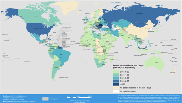 Bildirilen haftalık yeni ölümlerin vakalarının sayısı, her ikisi de önceki haftaya kıyasla benzer sayıda haftalık ölüm bildiren Amerika ve Avrupa Bölgeleri hariç tüm bölgeler için büyük (>%10) bir düşüş göstermiştir. Haftalık ölümlerde en büyük düşüş, bir önceki haftaya göre %25'lik bir düşüşle Afrika Bölgesi'nden bildirilmiştir.