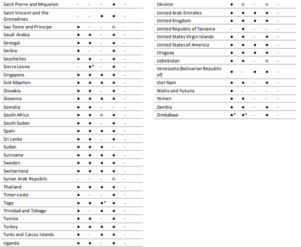 Ülkeler ve bölgeler, DSÖ yönetim bölgesi altında düzenlenmiştir. Belirli şirketlerin veya üreticilerin ürünlerinden bahsedilmesi, DSÖ tarafından onaylandığını veya söz konusu benzer nitelikteki diğer ürünlerin yerine önerildiğini ima etmemektedir. Hatalar ve eksiklikler hariç olmak üzere, tescilli ürünlerin isimleri, baş harfleri büyük olacak şekilde ayırt edilmektedir.