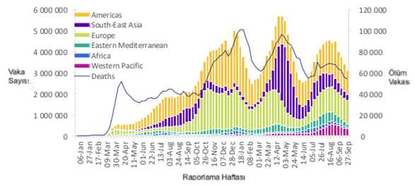 Küresel olarak, haftalık COVID-19 vaka ve ölümlerinin sayısı düşmeye devam etmiştir. Bu, Ağustos ayından beri gözlemlenen bir eğilimdir. 27 Eylül - 3 Ekim 2021 haftasında 3,1 milyondan fazla yeni vaka ve 54 000'den biraz fazla yeni ölüm bildirilmiştir. Bu hafta vakalar önceki haftaya göre %9 azalırken, ölüm sayısı önceki haftaya benzer şekilde gerçekleşmiştir.