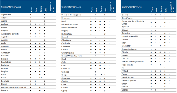 Küresel olarak, 195 ülke, yönetim bölgesi veya bölgede (bundan böyle ülkeler; geçen haftadan bu yana eklenen iki yeni ülke) Alfa varyantı vakaları rapor edilirken, 145 ülke (geçen haftadan bu yana 3 yeni ülke) Beta varyantı vakaları bildirmiş ve 99 ülke Gama varyantı vakalarını rapor etmiştir (4 yeni geçen haftadan beri Gama varyantına ilişkin 1 rapor dizileme üzerine atıldı) . Delta varyantı, 5 Ekim itibariyle altı DSÖ bölgesinin tamamında 192 ülkede (geçen haftadan bu yana yedi yeni ülke: 2'si doğrulama altında ve 5'i doğrulandı) rapor edilmiştir.