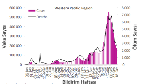 Batı Pasifik Bölgesi, bir önceki haftaya göre sırasıyla %17 ve %16 düşüşle 174.000'den fazla yeni vaka ve 2600'den fazla yeni ölüm vakası bildirmiştir. Bölgede devam eden düşüş eğilimlerine rağmen, vaka bildiren ülkelerin (%19/26; %73), dörtte birden fazlası (5/19; %26) geçen hafta yeni vakalarda artış bildirmiştir. En çok yeni vaka Malezya (41 508 yeni vaka; 100.000'de 128,2 yeni vaka; %21 düşüş), Filipinler (38 189 yeni vaka; 100.000'de 34,8 yeni vaka; %35 düşüş) ve Singapur'dan rapor edilmiştir (24 141 yeni vaka; 100.000'de 412,6 yeni vaka; %15 artış).