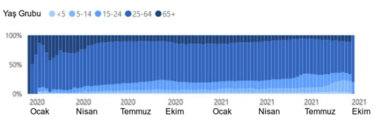 Şekil 6: Haftalık doğrulanan COVID-19 vakalarının yaşa göre oranı, COVID-19 DSÖ sürveyansı, Ocak 2020 -12 Ekim 2021 (n=99 067 915)