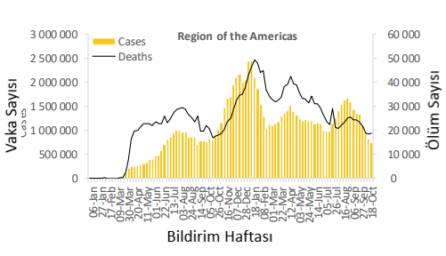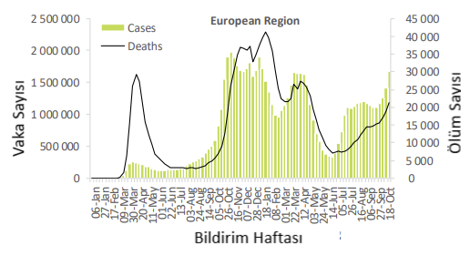 Avrupa Bölgesi, bir önceki haftaya göre sırasıyla %18 ve %14 artışla 1,6 milyondan fazla yeni vaka ve 21.000'den fazla yeni ölüm vakası bildirmiştir. Eylül ayının sonundan bu yana gözlemlenen eğilim, Bölge'de rapor edilen yeni vaka ve ölüm sayılarının artmasıyla bu hafta da devam etmiştir. Avrupa Bölgesindeki ülkelerin yarısından fazlası (42/61; %69) geçen hafta vakalarda artış bildirmiştir. En çok yeni vaka Birleşik Krallık (330 465 yeni vaka; 100.000'de 486.8 yeni vaka; %16 artış), Rusya Federasyonu (248 956 yeni vaka; 100.000'de 170,6 yeni vaka; %15) bildirilmiştir. artış) ve Türkiye'den rapor edilmiştir (196 850 yeni vaka; 100.000'de 233.4 yeni vaka; %8'lik bir düşüş).