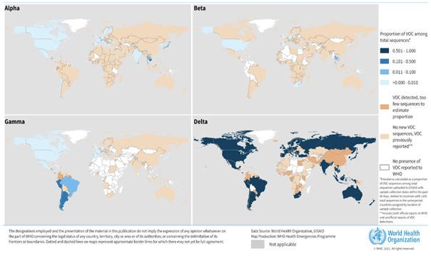 Mevcut küresel genetik epidemiyoloji, halka açık veri kümelerine sunulan veya DSÖ'ye rapor edilen SARS CoV 2 dizileri arasında diğer varyantların prevalansının azalmasıyla birlikte Delta varyantının baskınlığı ile karakterize edilmektedir (Şekil 5, Ek 1). Delta, çoğu ülkede diğer VOC'ler de dahil olmak üzere diğer varyantları geride bırakmıştır. Ancak, alt bölge ve ülke düzeyinde farklılıklar gözlemlenmeye devam etmektedir; en önemlisi bazı Güney Amerika ülkelerinde, Delta varyantının ilerlemesinin daha kademeli olduğu ve diğer varyantların (örneğin Gamma, Mu) hala sekansların büyük bir kısmına katkıda bulunmaktadır.