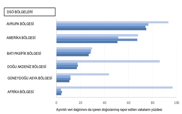 12 Ekim 2021 tarihi itibariyle, pandeminin başlangıcından bu yana 20 aydan fazla bir süre boyunca toplam 184 ülke, yönetim bölgesi ve bölge, küresel olarak bildirilen vakaların %70'inden fazlasını temsil eden 167 milyon COVID-19 vakası hakkında ayrıntılı bilgi paylaşımında bulunmuştur. Bu verilerin tamlığı/eksiksiz olması bölgeye göre (Şekil 4) ve gelir kategorileri arasında farklılık gösterirken, düşük gelirli ülkelerde verilerde daha fazla eksiklik söz konusudur. COVID-19 ölüm oranına ilişkin bilgilerle ilgili olarak, 184 ülke söz konusu vakaya dayalı raporlama sistemine 1.934 548 ölüm bildirmiş ve küresel olarak bildirilen ölüm sayısının %40'ından azını temsil etmektedir.