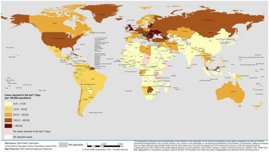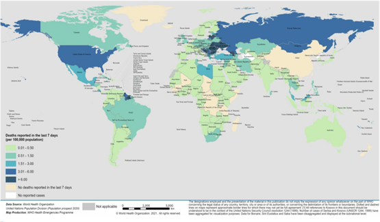 100.000 nüfus başına en yüksek haftalık vaka insidansı oranlarını bildiren bölgeler, Avrupa Bölgesi (100.000 nüfus başına 179.1 yeni vaka) ve Amerika Bölgesi (100.000 nüfus başına 72,9 yeni vaka) olup aynı iki bölge, sırasıyla 100.000 nüfus başına 2.3 ve 1.8 ile haftalık en yüksek ölüm insidansını bildirmiştir.