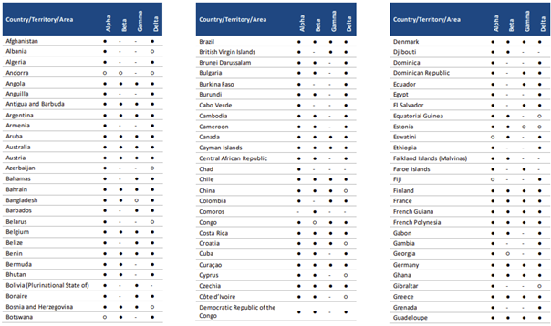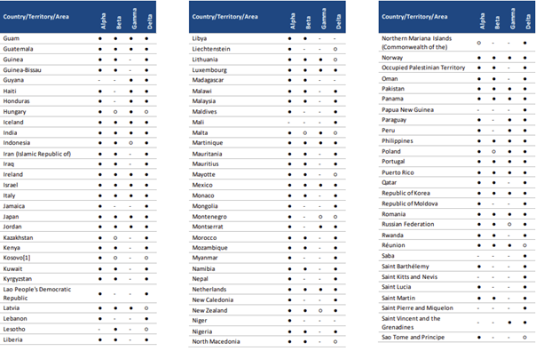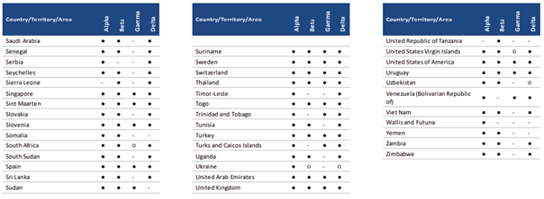 ** Seyahat edenler arasında VOC tespitini bildiren ülkeleri / bölgeleri / alanları (örn. Giriş noktalarında tespit edilen importe vakalar) veya yerel vakaları (toplulukta tespit edilen) içerir. Endişe verici varyantın tespit edildiğini hiç bildirmemiş ülkeleri, bölgeleri ve alanları hariç tutmaktadır.