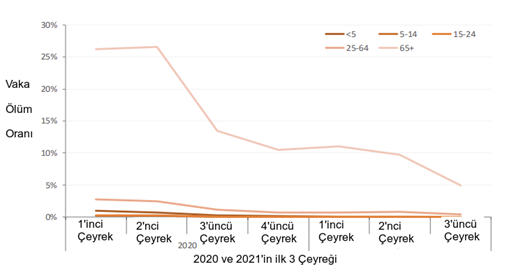 Yaşa özel vaka ölüm oranlarındaki eğilimler (CFR) Şekil 7, yaş grubuna ve 3 aylık zaman dilimine göre CFR'leri göstermektedir. 64 yaşın altındakiler arasında CFR, pandemi boyunca %2,5'in altında kalmıştır. 2020'nin ikinci çeyreğinden (Nisan-Eylül) bu yana, 65 yaş ve üzerindekiler arasında CFR, 2020'nin ikinci çeyreğinde %26'dan 2021'in üçüncü çeyreğinde %5'e düşmüş olup bu, büyük olasılıkla yaş grubunda aşılama dahil ancak bunlarla sınırlı olmamak üzere hedefe yönelik COVID-19 önleyici tedbirlerin uygulanmasının yanı sıra zaman içinde klinik bakımdaki gelişmelerin bir sonucudur.