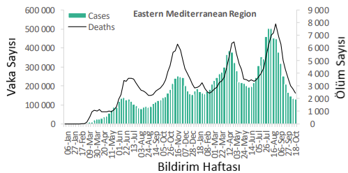 Doğu Akdeniz Bölgesi'nde vaka ve ölüm sayısı bu hafta da düşmeye devam etmiş, 130.000'in biraz altında yeni vaka ve 2400'den fazla yeni ölüm vakası bildirilmiş olup bir önceki haftaya göre sırasıyla %5 ve %13'lük bir düşüş yaşanmıştır. Hem vakalarda hem de ölüm sayılarında bu düşüş eğilimi Temmuz 2021'in sonundan bu yana gözlenmiştir. Geçen hafta, bölgedeki ülkelerin üçte birinden biraz azı (6/22; %27) yeni vakalarda artış bildirmiş ve en yüksek artışlar Sudan (%57) ve Suriye'de (%26) gözlemlenmiştir. En çok yeni vaka sayısı İran (78 251 yeni vaka; 100.000'de 93.2 yeni vaka; önceki hafta bildirilen sayıya benzer şekilde), Irak'tan (11 290 yeni vaka; 100'de 28.1 yeni vaka) bildirildi. 000; önceki hafta bildirilen sayıya benzer) ve Ürdün'den bildirilmiştir (9641 yeni vaka; 100.000'de 94.5 yeni vaka; %25 artış).