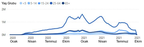 Yaş, küresel vakaların %40'ını temsil eden toplam 99 067 915 vakadan rapor edilmiştir (Şekil 5). Temmuz 2021'in başından itibaren özellikle Avrupa ve Batı Pasifik bölgelerinde 0-24 yaş arasındaki vaka oranlarında artış gözlemlenmeye başlanmıştır (Şekil 6). Bu muhtemelen kısmen çoğu ülkede aşılama için daha büyük yaş gruplarına öncelik verilmesinden kaynaklanmaktadır. Ek olarak, çocuklar ve gençler arasında güçlendirilmiş test stratejilerinin uygulanmasıyla birlikte yüz yüze eğitimin yeniden başlatılması da 0-24 yaşları arasında bildirilen vakalarda gözlenen artışa katkıda bulunmuş olabilir. Bununla birlikte, genel enfeksiyon ve hastalık oranları, çocuklar ve genç yetişkinler arasında düşük kalmaktadır.