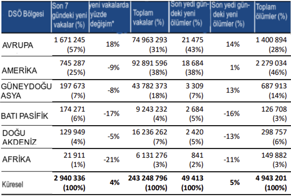 Yeni ölümlerin sayısı da geçtiğimiz hafta içinde %5 oranında hafif bir artış göstermiş ve 49.000'den fazla yeni ölüm bildirilmiştir. Avrupa (%14) ve Güneydoğu Asya (%13) bölgelerinde artışlar rapor edilmiş olup en büyük düşüşler ise Batı Pasifik (%16), Doğu Akdeniz (%13) ve Afrika (%11) bölgelerinde görülmüştür.