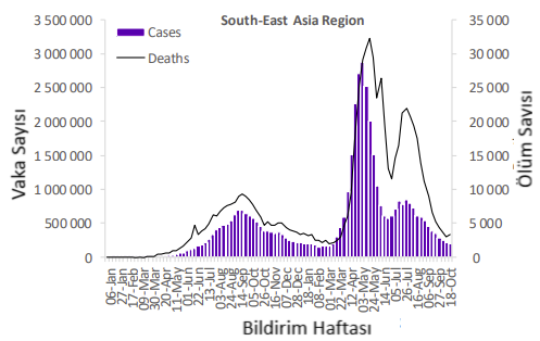 Öte yandan, yeni haftalık ölüm vaka sayıları, büyük ölçüde Hindistan (%40 artış) ve Nepal'deki (%21 artış) artışlara bağlı olarak bu hafta önceki haftaya göre %13 artmıştır. En çok yeni ölüm vakası Hindistan (2145 yeni ölüm; 100.000'de <1 yeni ölüm; %40 artış), Tayland (482 yeni ölüm; 100.000'de <1 yeni ölüm; %17 düşüş) ve Endonezya'dan bildirilmiştir (253 yeni ölüm; 100.000'de <1 yeni ölüm; %16'lık bir düşüş).