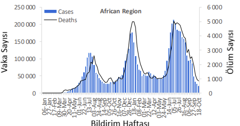 Afrika Bölgesi'nde Temmuz ortasından bu yana gözlemlenen düşüş eğilimi, bu hafta 22.000'den fazla yeni vaka ve bildirilen 800'den fazla yeni ölüm vakasıyla devam etmiş olup bir önceki haftaya göre sırasıyla %21 ve %11'lik bir düşüş görülmüştür. Bu güven verici olsa da, Bölgedeki 49 ülkeden on tanesi (%20), bir önceki haftaya göre yeni haftalık vakalarda artış bildirmiş ve en büyük artış Réunion (%578), Botsvana (%116) ve Gambiya (%100) gibi ülkelerde olmuştur. En çok yeni vaka bildirimi Güney Afrika (3153 yeni vaka; 100.000 nüfus başına 5,3 yeni vaka; %33 düşüş), Botsvana (3063 yeni vaka; 100.000 başına 130,3 yeni vaka; %116 artış) ve Etiyopya'dan (2908 yeni vaka; 100.000'de 2.5 yeni vaka; %38 azalma)olmuştur.
