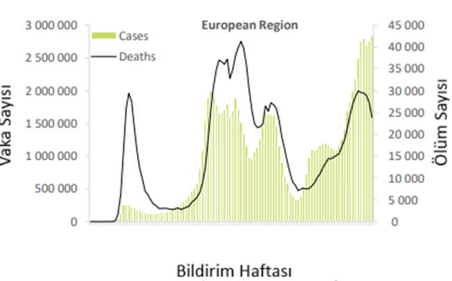 Avrupa Bölgesi, önceki hafta bildirilen sayıya benzer şekilde 2,8 milyondan fazla yeni vaka bildirmiştir. Bununla birlikte, haftalık ölüm insidansı %12 azalmış ve 24.000'den fazla yeni ölüm vaksı rapor edilmiştir. İstikrarlı eğilime rağmen, ülkelerin üçte biri (20/61) vakalarda %10'un üzerinde haftalık bir artış bildirmiş olup en yüksek artışlar Malta (4107'ye karşı 1103 yeni vaka, %272'lik bir artış), İsrail (9076'ya karşı 4886) yeni vakalar, %86 artış) ve Portekiz’den (55 217 vs 30427 yeni vaka, %81 artış) rapor edilmiştir. En çok yeni vaka bildiren ülkeler Birleşik Krallık (611 864 yeni vaka; 100.000'de 901.3 yeni vaka; %20 artış), Fransa (504642 yeni vaka; 100.000'de 775.9 yeni vaka; %41 artış) ve İtalya (257 579 yeni vaka; 100.000'de 431,9 yeni vaka; %62 artış) olmuştur.