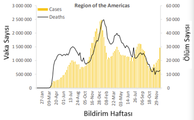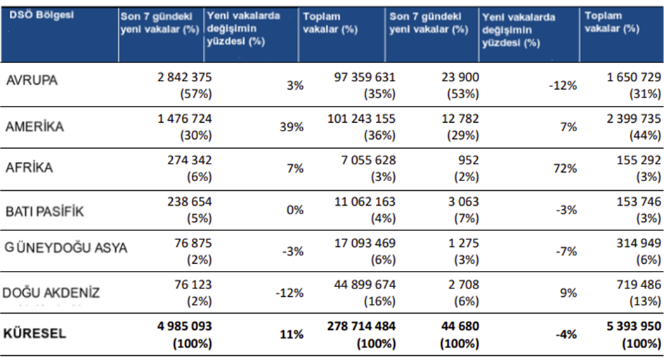 Amerika Bölgesi, geçen hafta yeni vakalarda en büyük artışı (%39) bildirirken, onu %7'lik bir artış bildiren Afrika Bölgesi izlemiştir. Güneydoğu Asya Bölgesi yeni vakalarda önceki haftaya göre (%12) bir düşüş bildirmeye devam ederken, Avrupa, Doğu Akdeniz ve Batı Pasifik Bölgelerinde yeni vakaların sayısı önceki hafta bildirilenlere benzer şekilde gerçekleşmiştir. Afrika Bölgesi, yeni ölüm sayısında en yüksek artışı (%72) bildirirken, onu Güney-Doğu Asya Bölgesi (%9) ve Amerika Bölgesi (%7) izlemiştir. Avrupa ve Doğu Akdeniz Bölgesi ölüm insidansında sırasıyla %12 ve %7’lik bir düşüş bildirirken, Batı Pasifik Bölgesi'nde insidans önceki haftalara benzer şekilde gerçekleşmiştir.