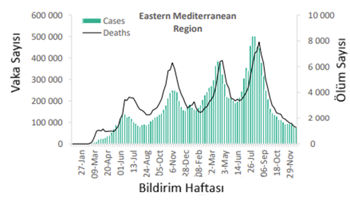Doğu Akdeniz Bölgesi'ndeki haftalık vaka insidansı, 76.000'den fazla yeni vaka ile bir önceki hafta bildirilen insidansa benzer şekilde gerçekleşmiştir. Ülkelerin yarısı (11/22) vakalarda %10'un üzerinde artış bildirmiş olup en yüksek artış Birleşik Arap Emirlikleri (5678'e karşı 1133 yeni vaka, %401 artış); Somali (363'e karşı 95 yeni vaka, %282 artış) ve Suudi Arabistan’dan (1668'e karşı 549 yeni vaka, %204 artış) bildirilmiştir. En yüksek sayıda yeni vaka bildirimide bulunan ülkeler Ürdün (17 952 yeni vaka; 100.000'de 267.9 yeni vaka; %34'lük bir düşüş), İran (13 894 yeni vaka; 100 000'de 16.5 yeni vaka; %16 düşüş) ve Lübnan (11 795 yeni vaka; 100.000'de 172.8 yeni vaka; %8 artış) olmuştur.