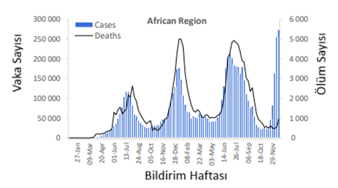 Afrika Bölgesi 274.000'den fazla yeni vaka bildirmiş olup insidanstaki haftalık artış, önceki haftanın insidansına (%53) kıyasla daha küçüktür (%7). Bölgedeki ülkelerin yaklaşık üçte ikisinde (32/49; %65) vaka insidansında %50'nin üzerinde artışlar gözlenmiştir. En çok vaka rapor eden ülkeler Güney Afrika (115 328 yeni vaka; 100.000 nüfus başına 194.5 yeni vaka; %29 düşüş), Etiyopya (19 940 yeni vaka; 100.000 nüfus başına 17,3 yeni vaka; %610 artış) rapor edildi. ) ve Kenya (19 023 yeni vaka; 100.000'de 35.4 yeni vaka; %207 artış) olmuştur.