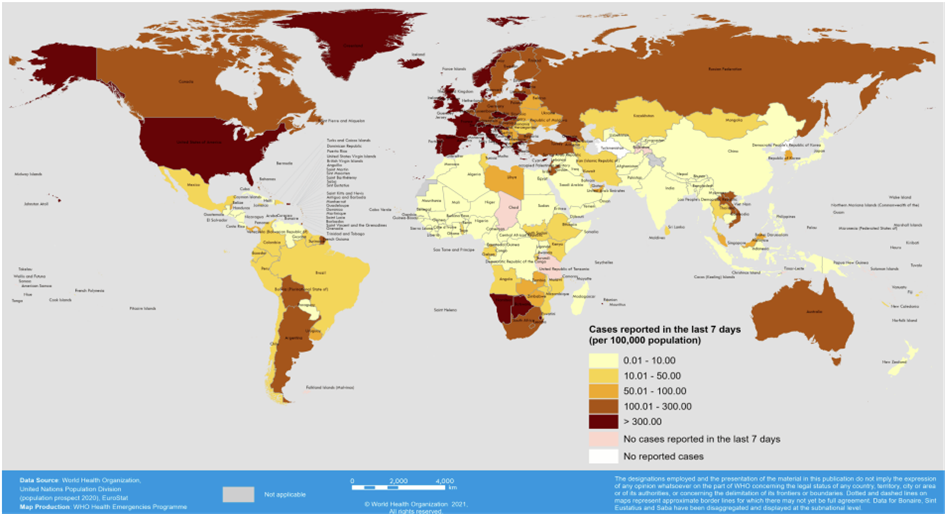 Şekil 2. Ülkelere ve bölgelere göre, son yedi günde 100.000 nüfus başına bildirilen COVID-19 vakaları, 20-26 Aralık 2021 **